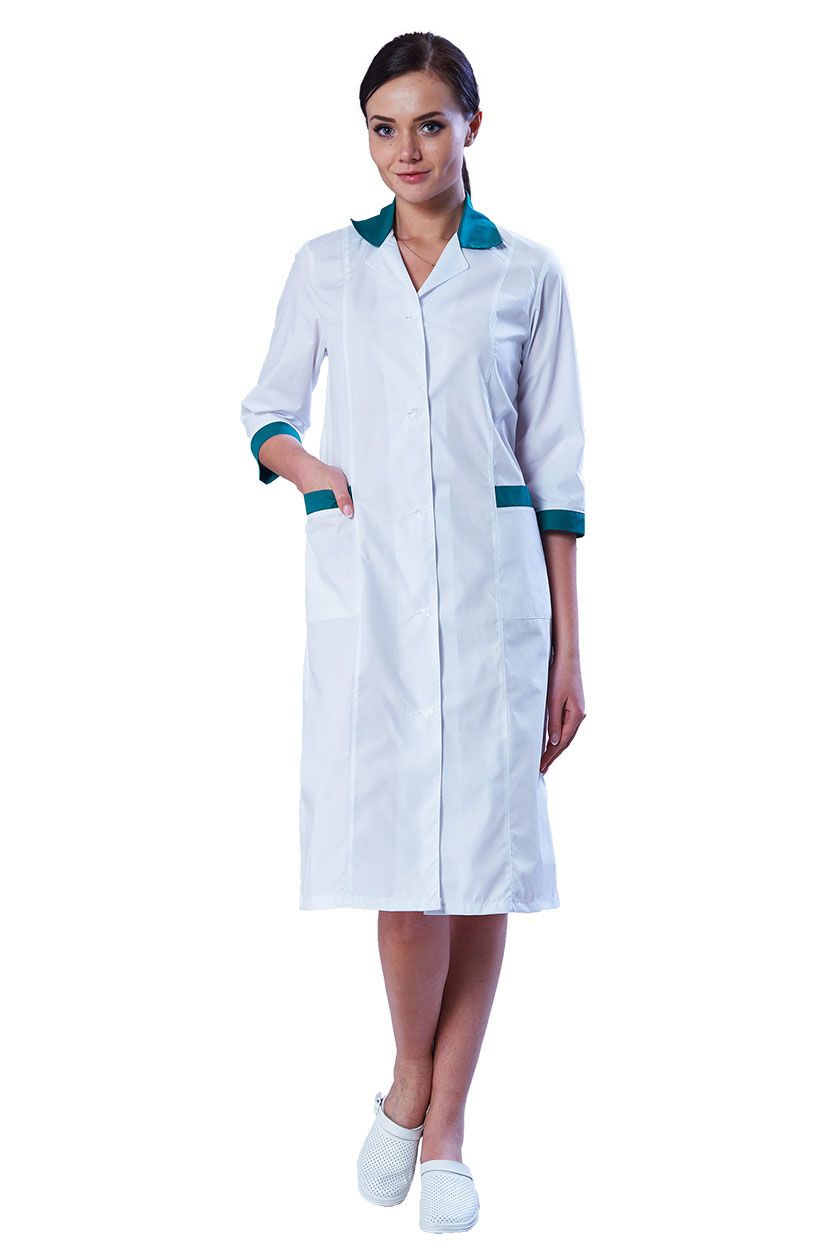 Халат полуприлегающего силуэта с центральной бортовой застежкой на пуговицы. Полочки с рельефами от линии плеча, с двумя нижними карманами с обтачками зеленого цвета. По линии талии спинки хлястик, с застежкой на пуговицы. Воротник отложной с лацканами. Верхний воротник контрастного цвета.