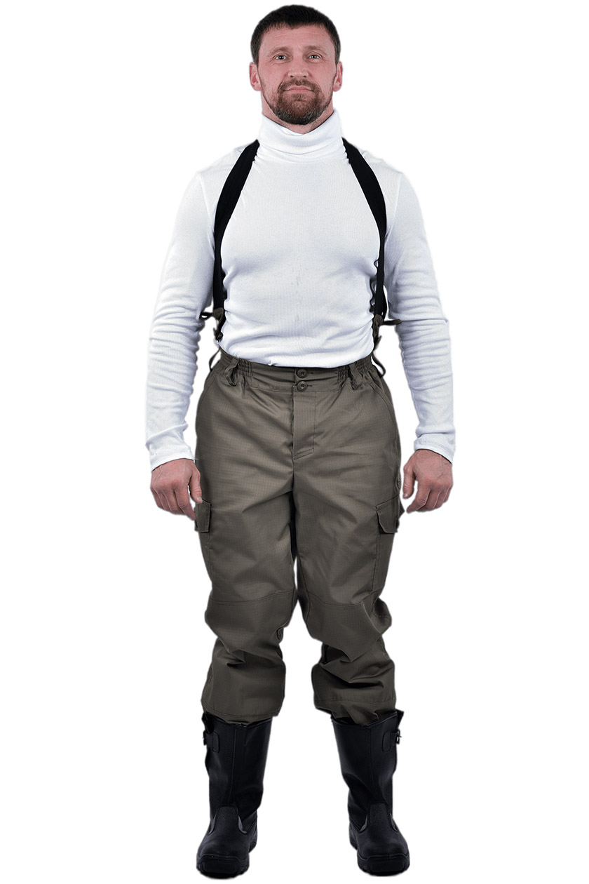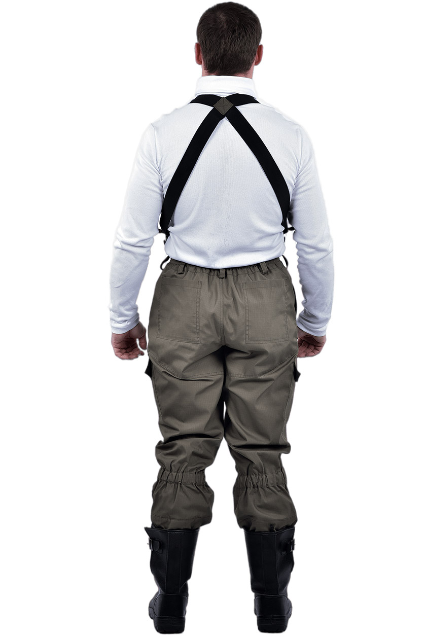 ➠ Брюки: пояс на эластичной тесьме, застегиваются на пуговицы с супатной застежкой гульфика. Бретели на резинке, крепление к брюкам на пуговицы. По линии колена кулиски стянутые эластичной тесьмой, по бокам над коленями накладные карманы с клапанами с застежкой на пуговицу.