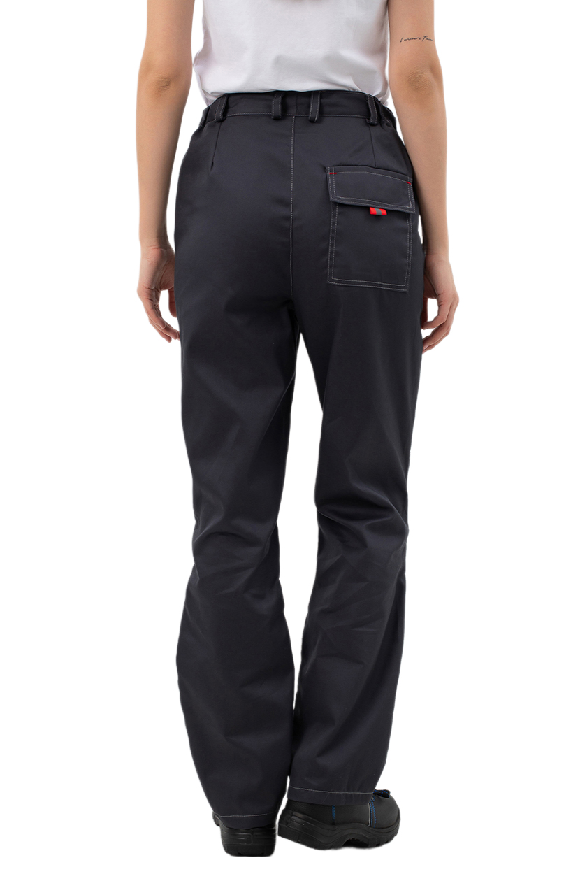 ➠ Брюки с застежкой на пуговицы, с притачным поясом, стянутым резинкой в области боковых швов для лучшей посадки на фигуре, пояс со шлевками. Застежка пояса на пуговицу. Брюки с боковыми карманами с отрезным бочком с наклонной линией входа. На наколенниках настрочены вытачки, для эргономичности. На задней половинке брюк накладной карман с клапаном с застежкой на липучку.