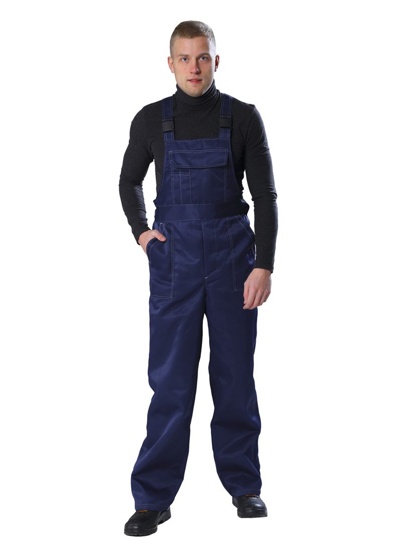 Полукомбинезон с втачной в пояс грудкой и спинкой, застежка гульфика на пуговицы, с левого бока шва имеется застежка на пуговицы. Передние половинки с двумя боковыми накладными карманами.