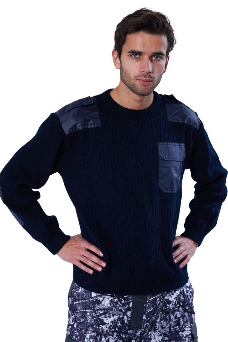 Свитер с усилительными накладками в области плеч и локтей из водоотталкивающей ткани, а также погоны и накладной карман.