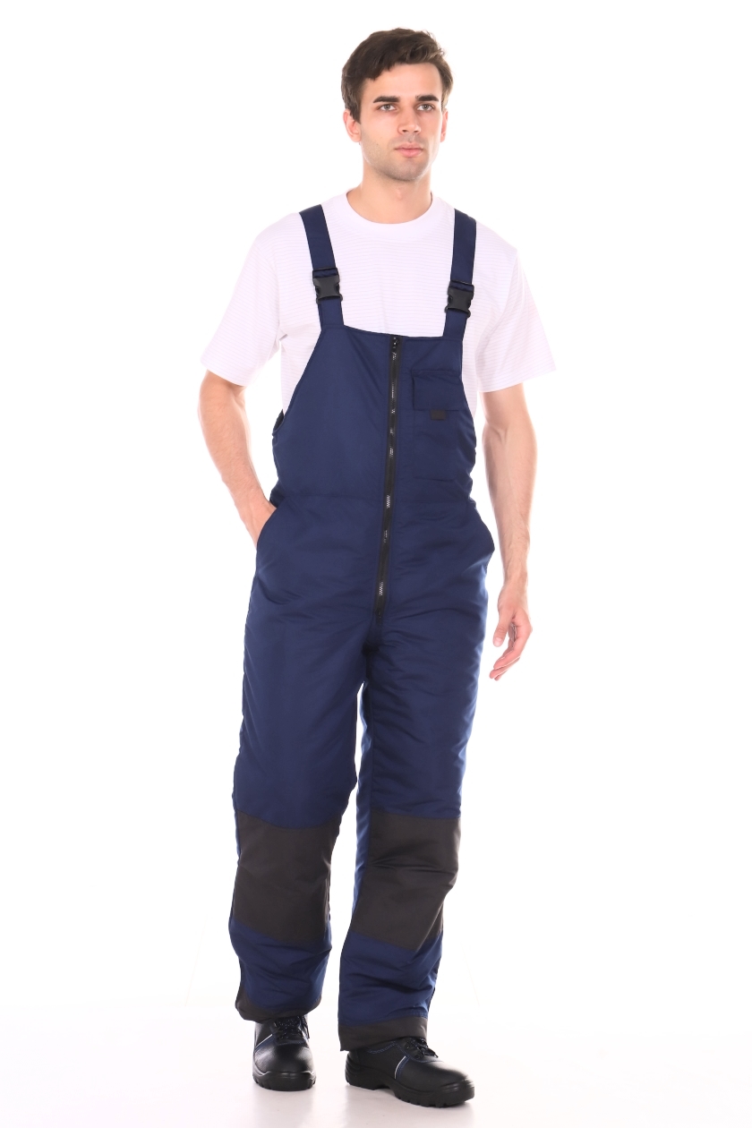 ➠ Полукомбинезон с центральной застежкой на двухзамковую тесьму «молния», с внутренней ветрозащитной планкой, с притачными по линии талии полочками и спинкой. На левой полочке накладной карман с клапаном.. Спинка стянута по линии талии эластичной тесьмой.. Передние половинки с карманами с отрезным бочком, с наколенниками. Внизу боковых швов обработаны разрезы, застегивающиеся на тесьму «молния». По низу полукомбинезона пуфты.